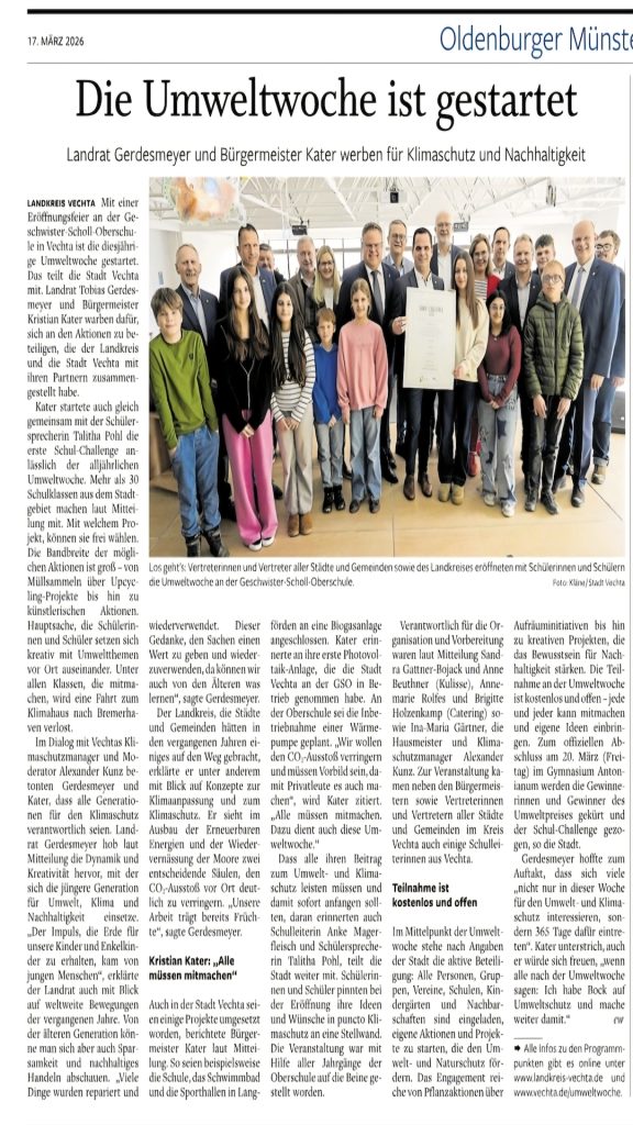 Das ist das Motto der Klassen 10a, 12a und 12b, sie sammeln im Umfeld der Schule Müll. Unglaublich viel ist schon zusammen gekommen. Die Klassen nehmen auch an der erstmaligen „Schul-Challenge“ der Stadt Vechta teil. Der Start der besonderen Challenge war am Montag, 16.03., die Ergebnisse werden am Freitag, 20.03. vorgestellt. Einige Schüler waren sehr stolz und trauten sich zu auf dem gemeinsamen Pressefoto zu sein. Die OM Medien waren vor Ort und ein großer Artikel ist entstanden.